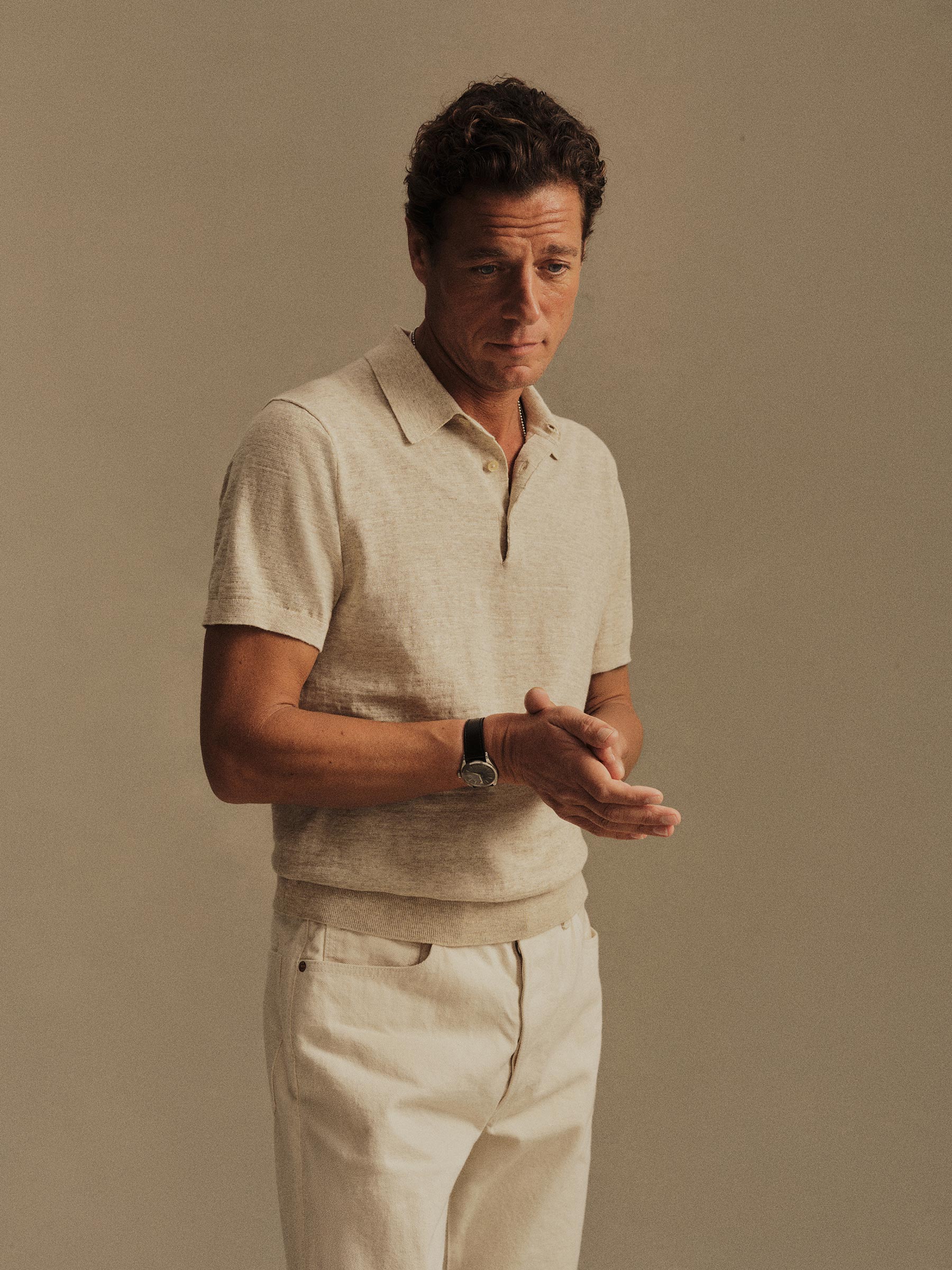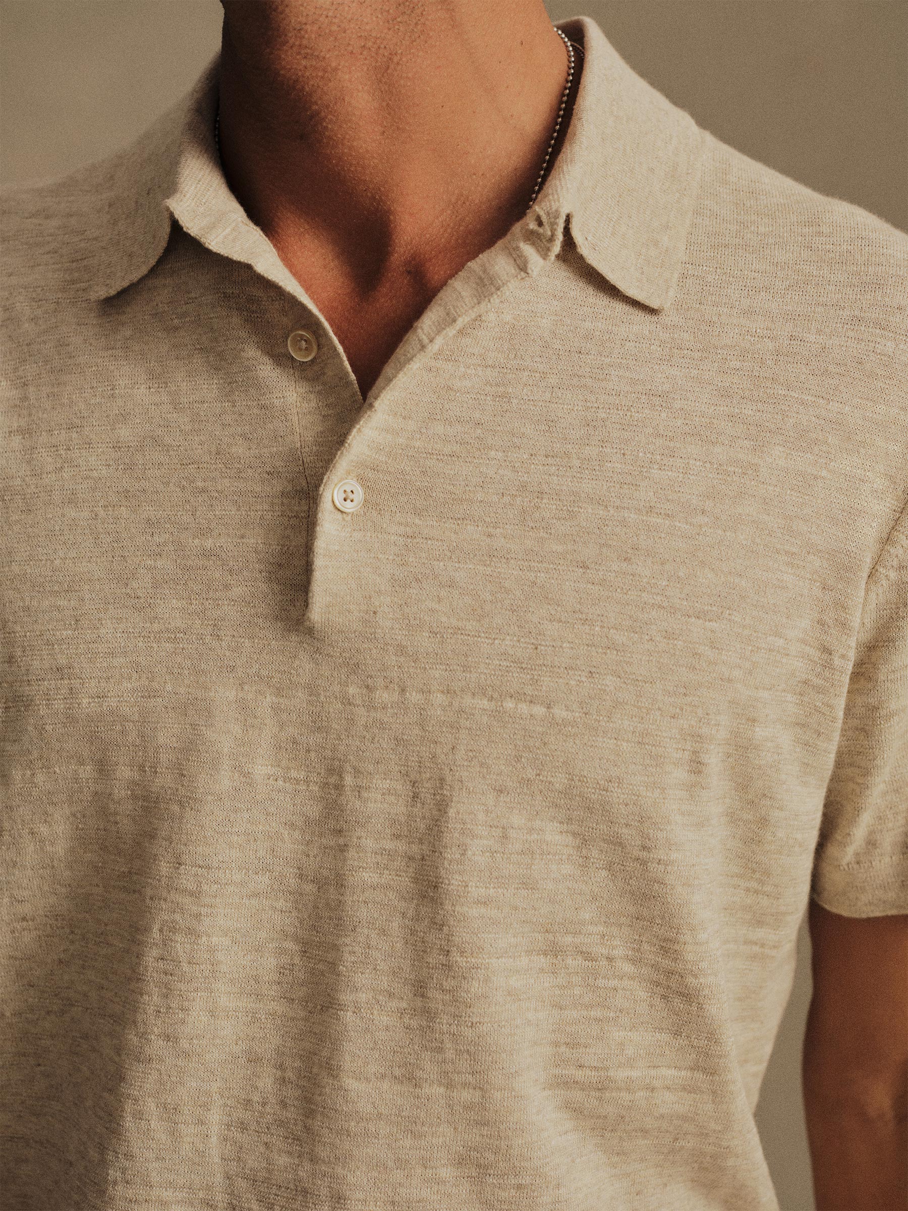 Classic collared sweater knit with a light slub texture that breathes easily with a crisp, refined finish.