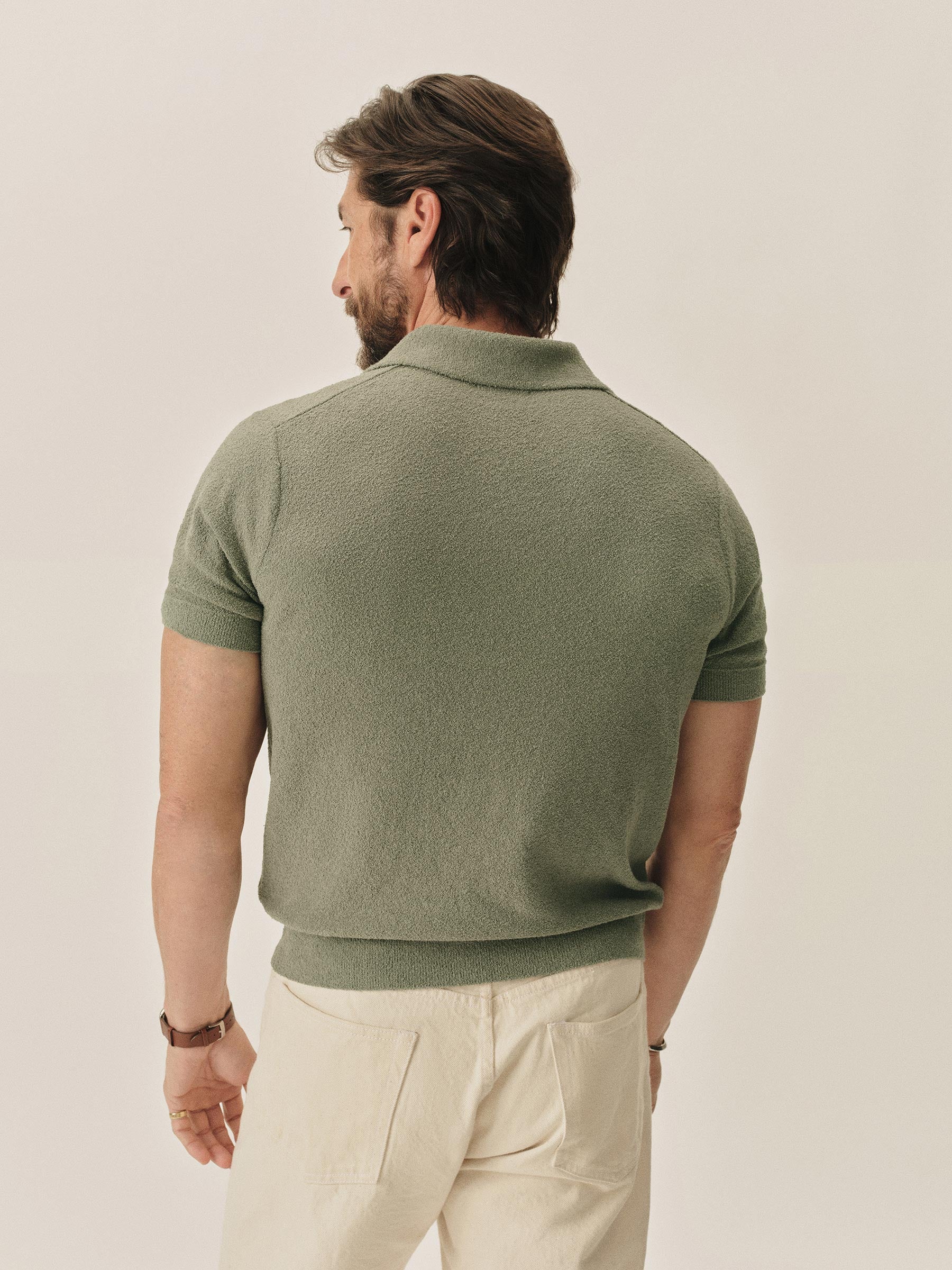 Textured knit polo with ribbed waistband and cuffs. Inspired by 1960s resort wear.