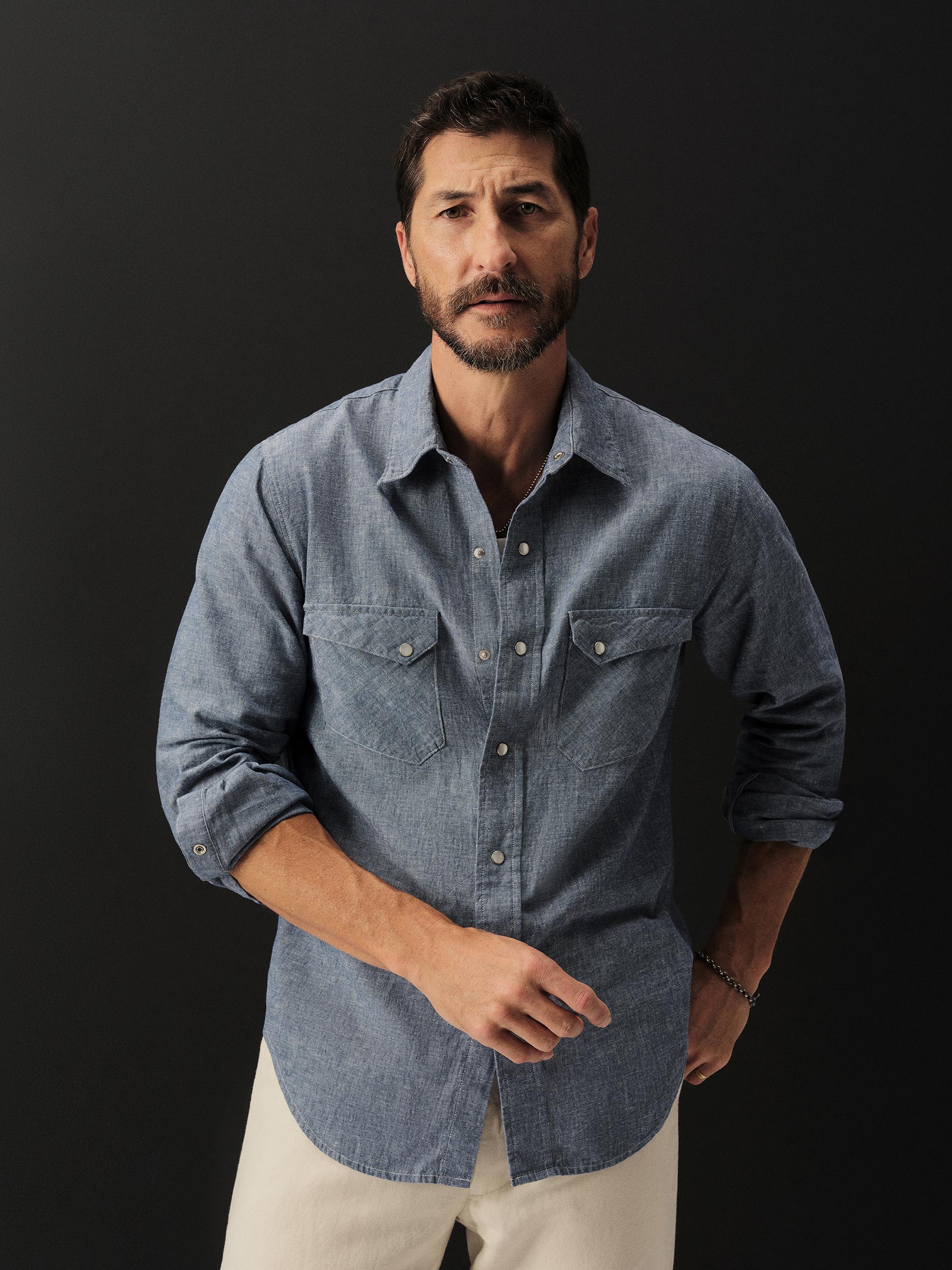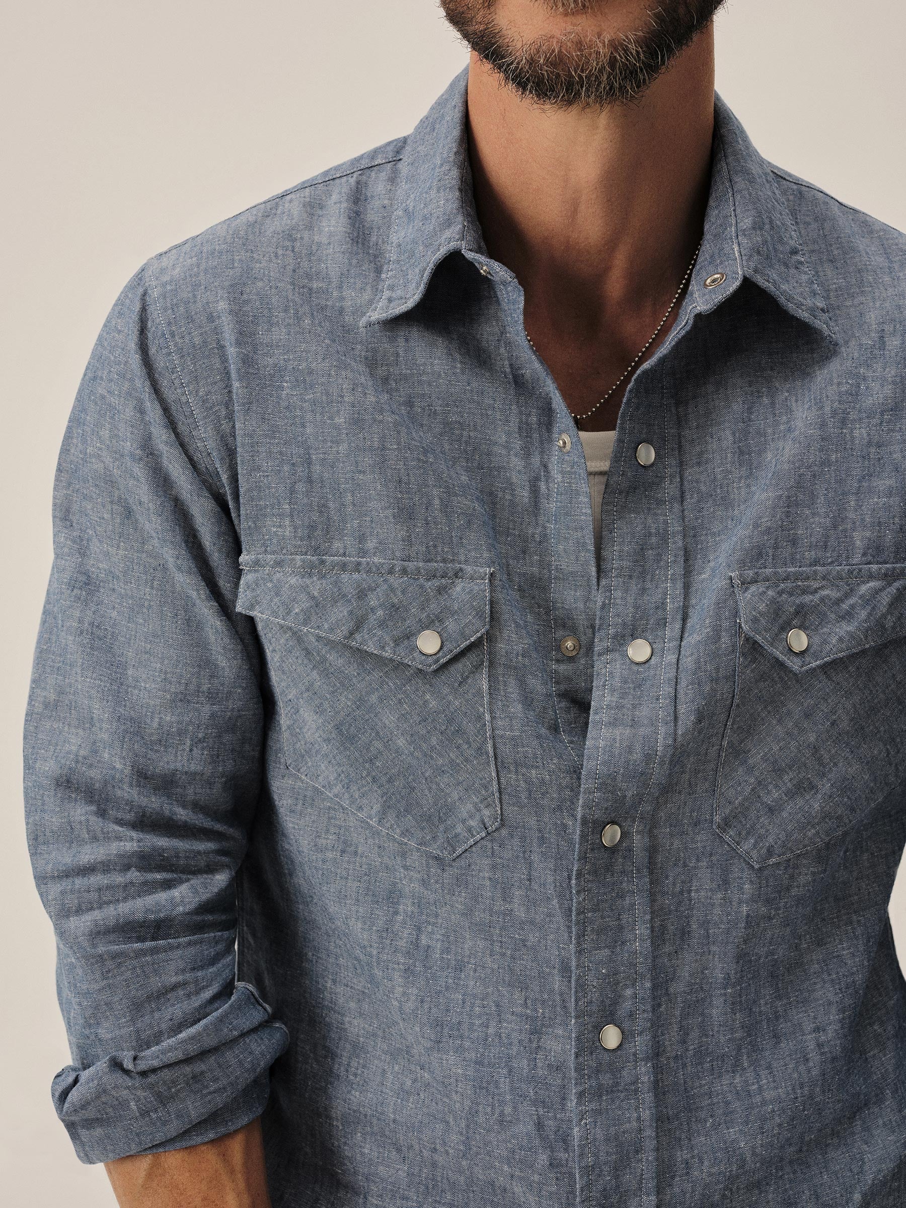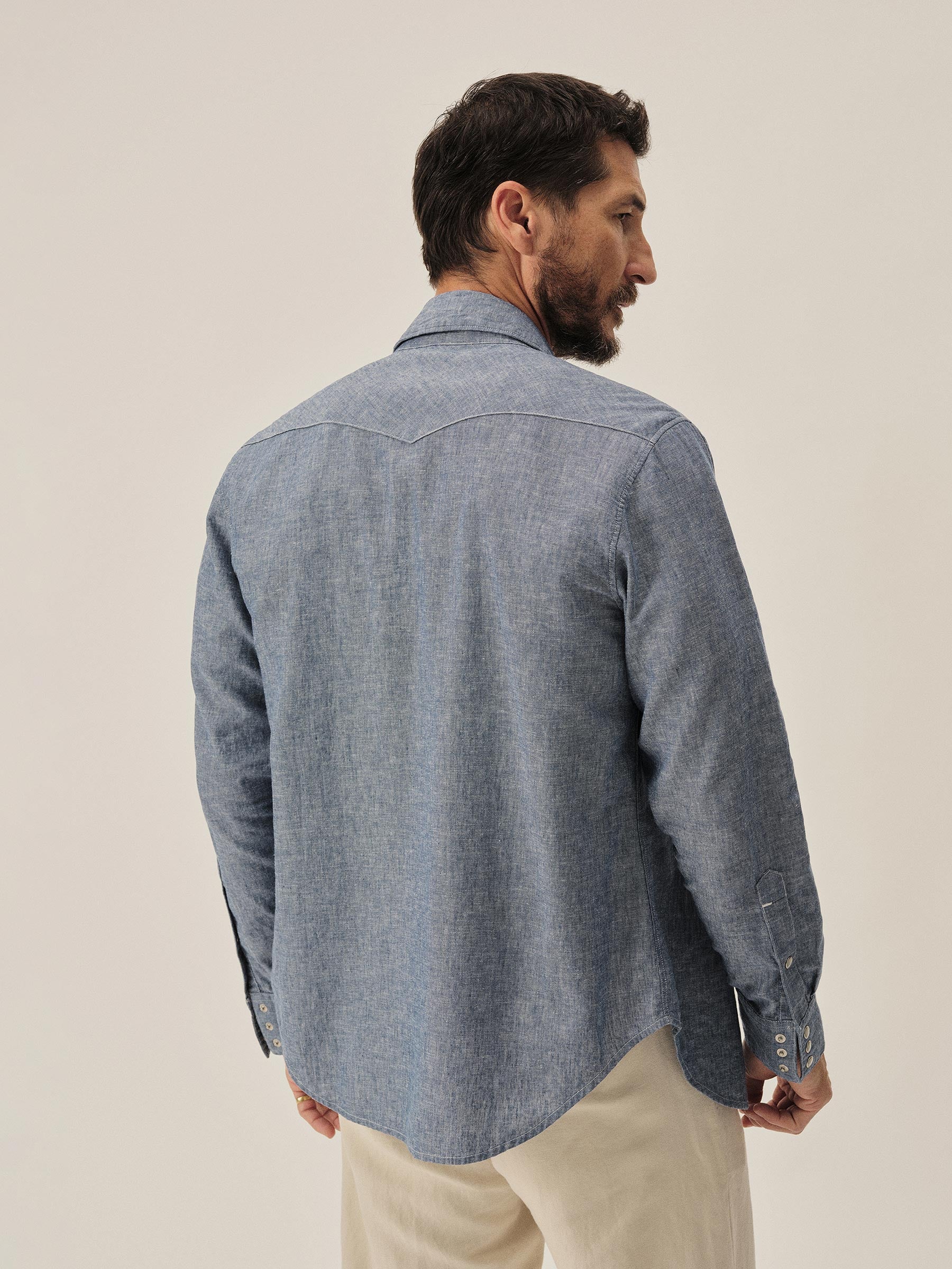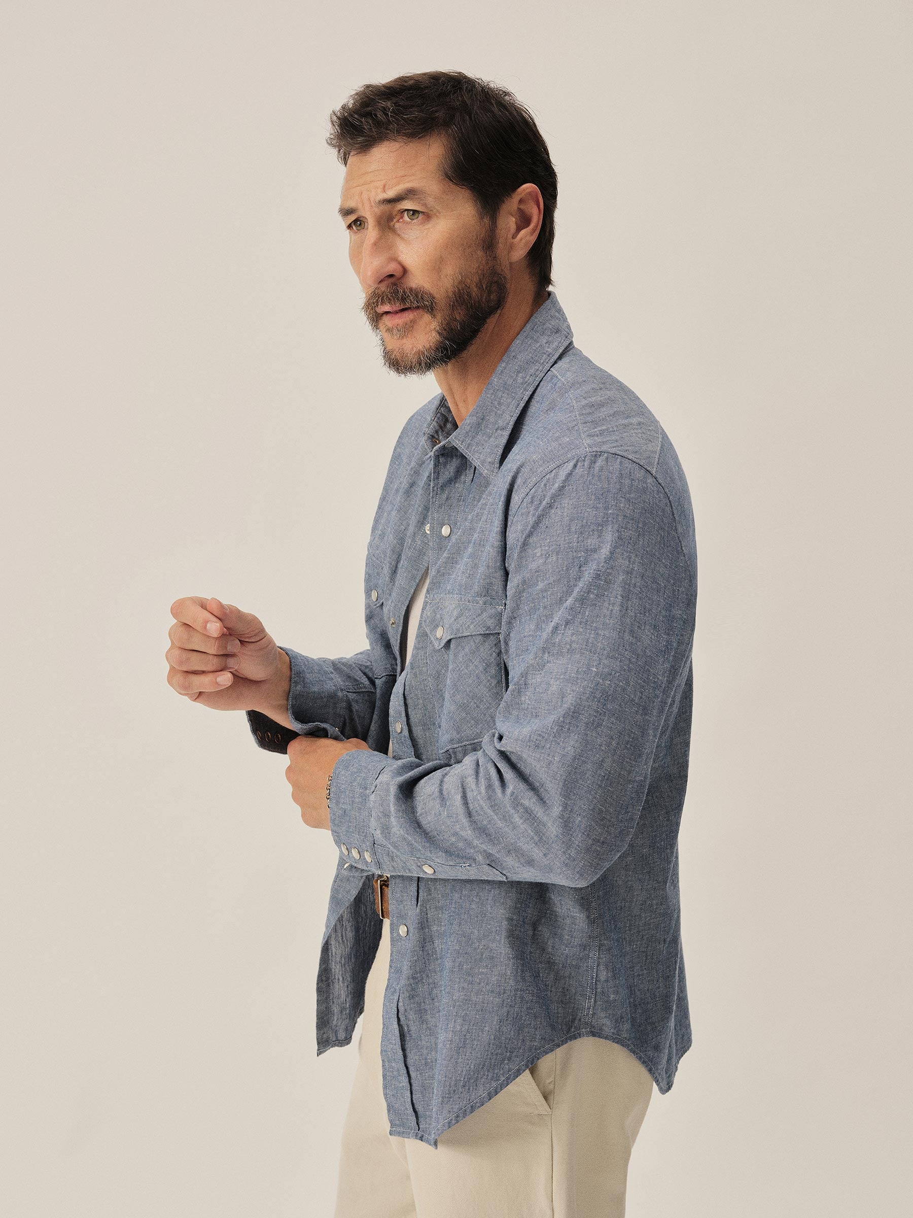 In the style of the 1940s, a classic fit western with slanted pocket flaps, cut from a yarn-dyed blend of breezy linen and cotton.