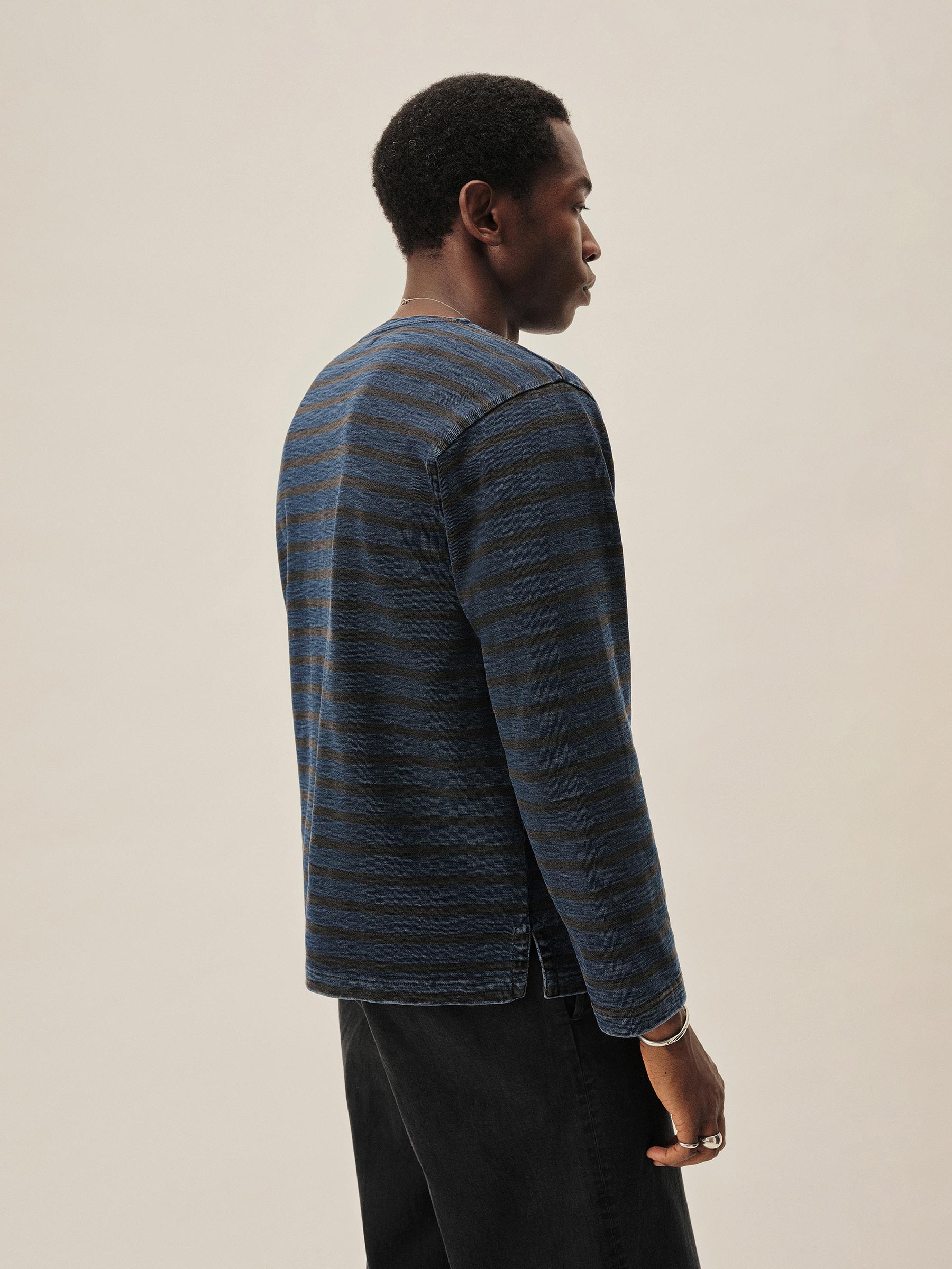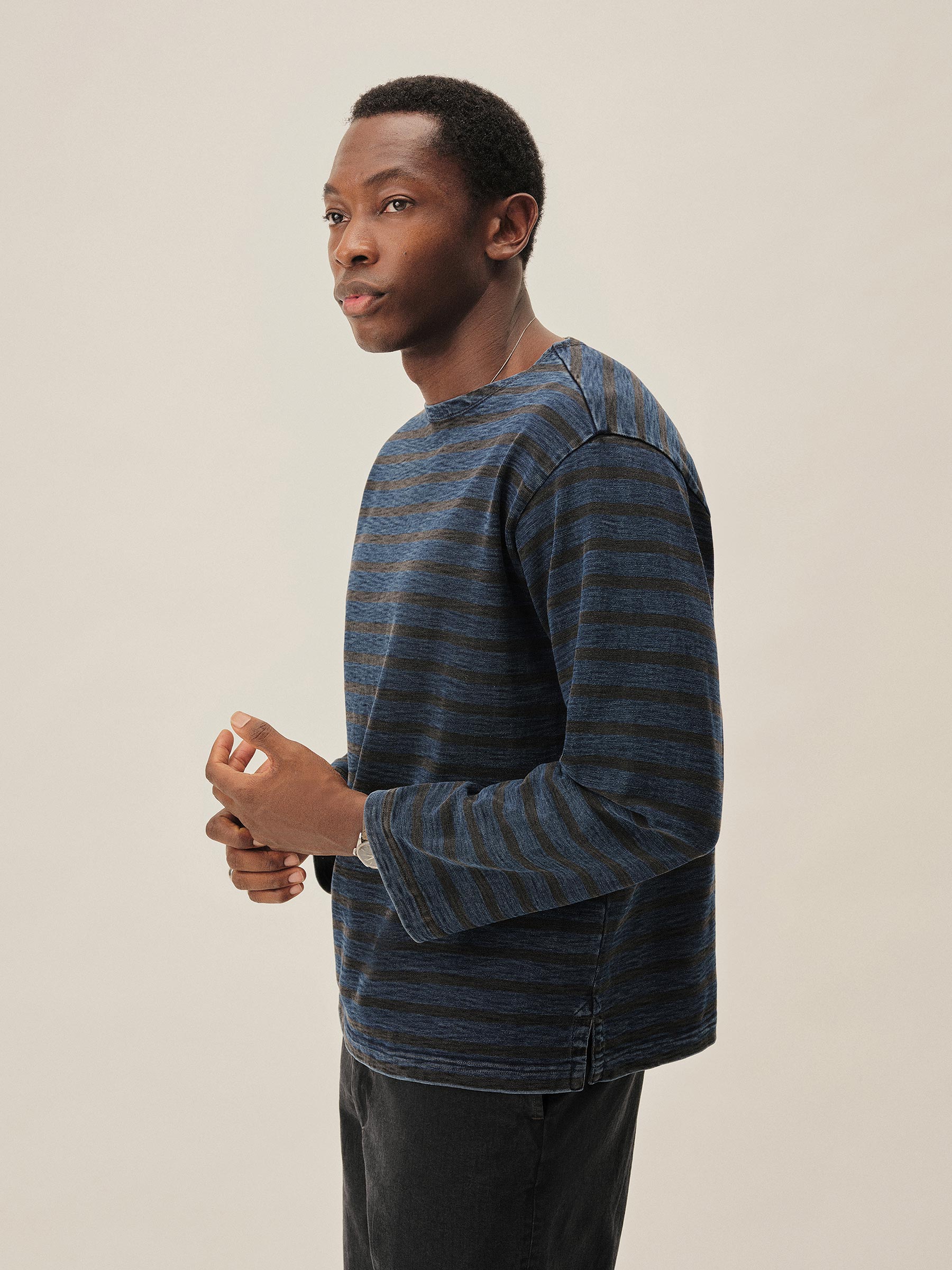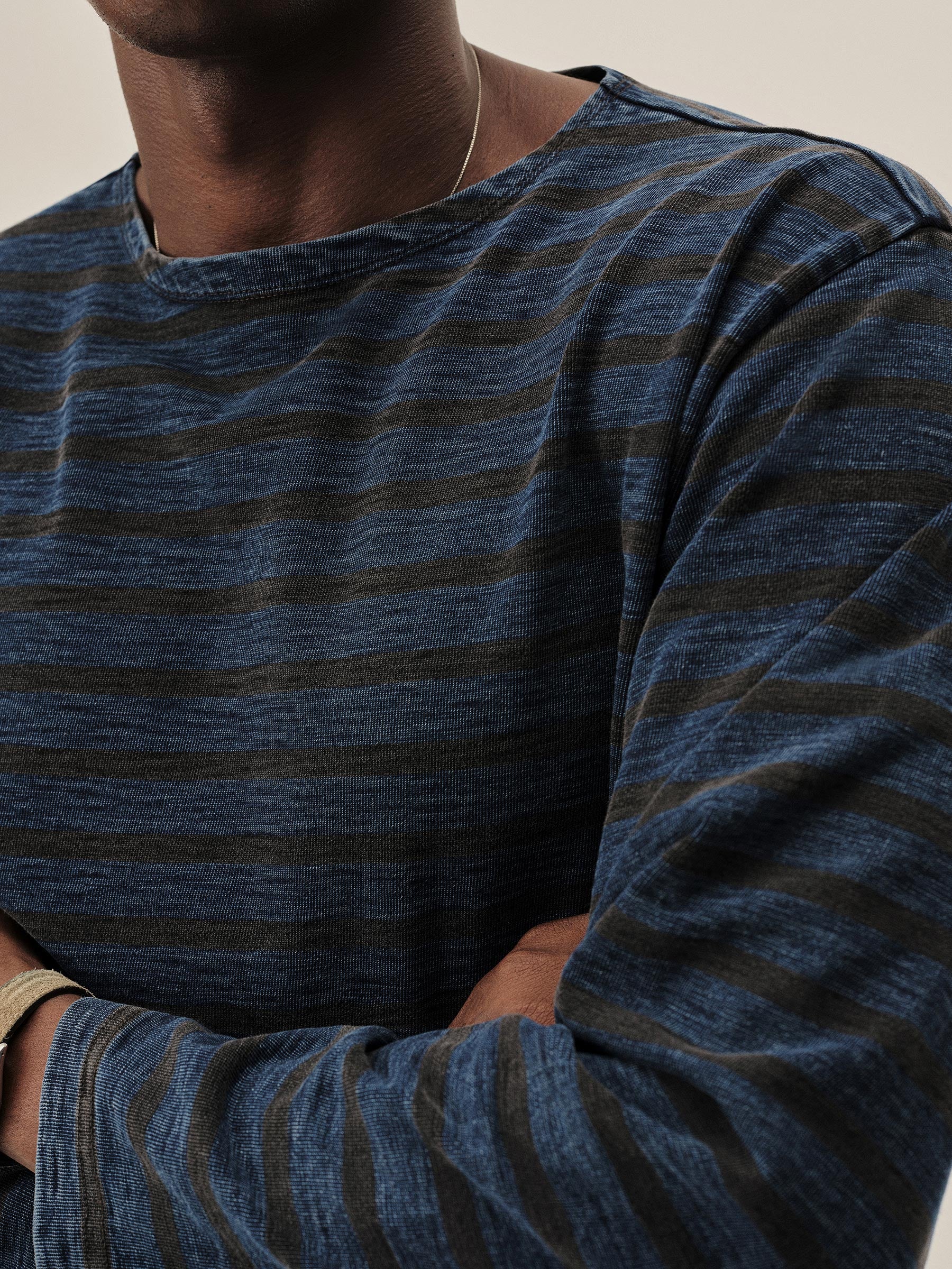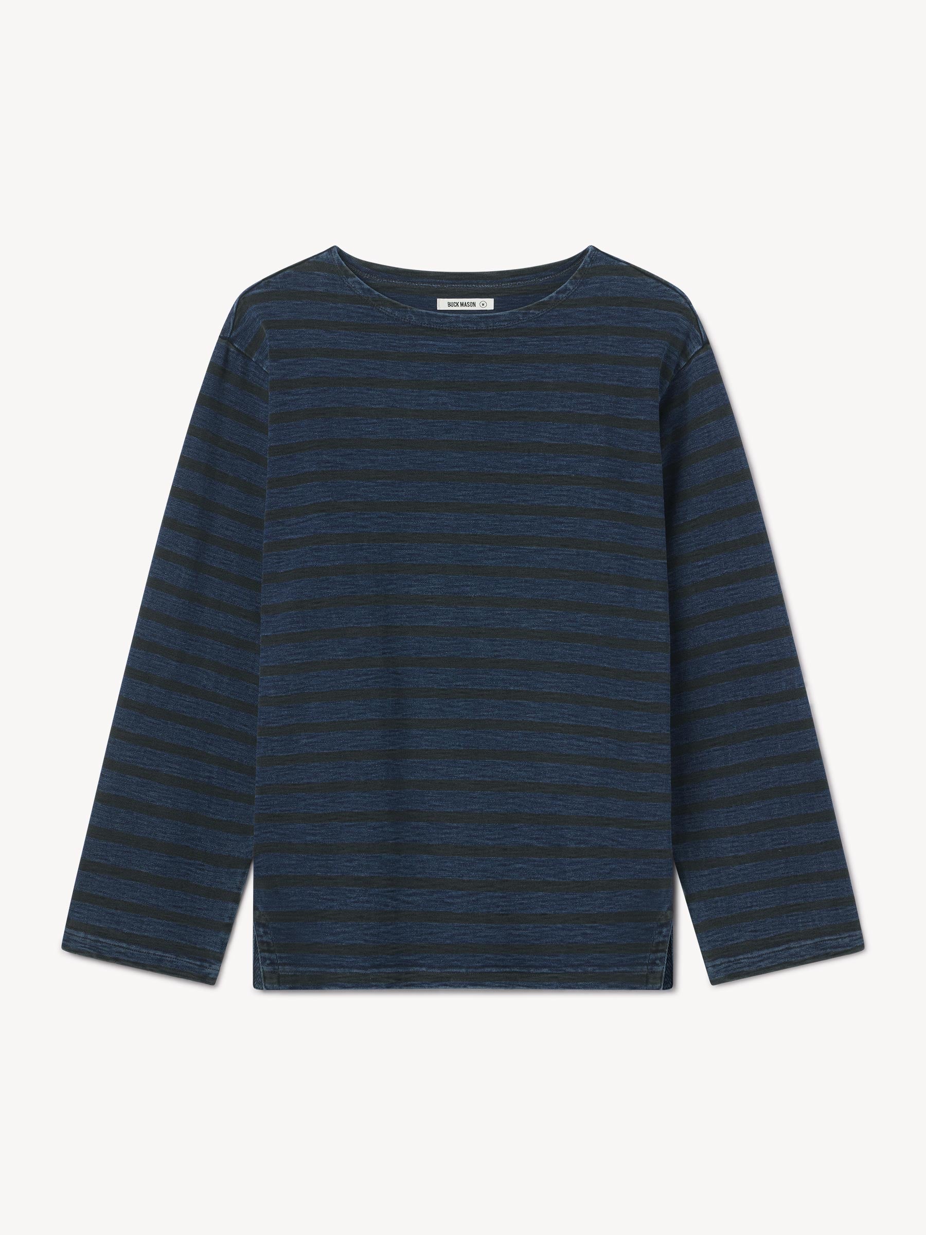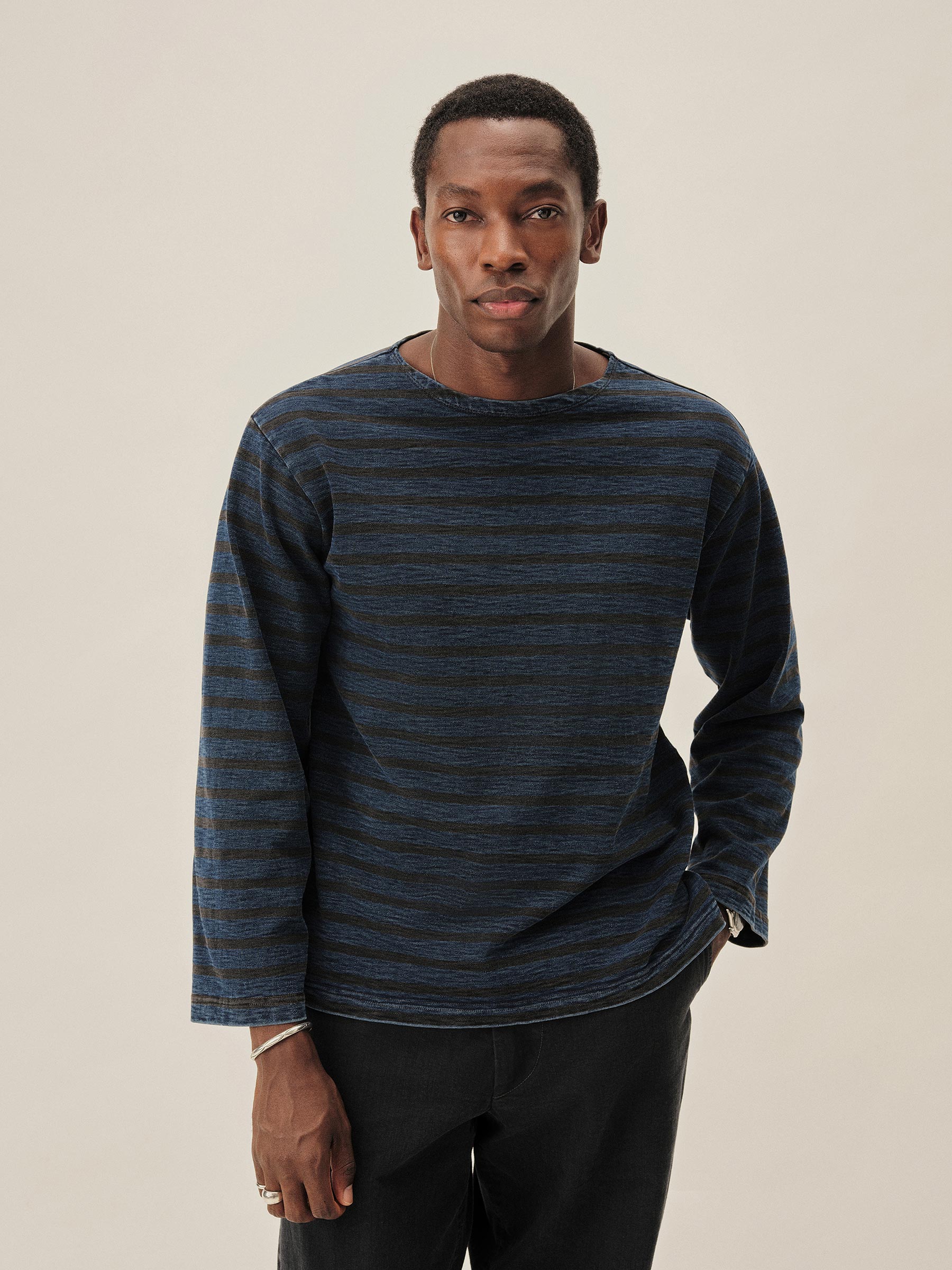 Our nautical-inspired wide neck tee cut from broken-in yet hard-wearing cotton with indigo and black sulfur-dyed stripes.