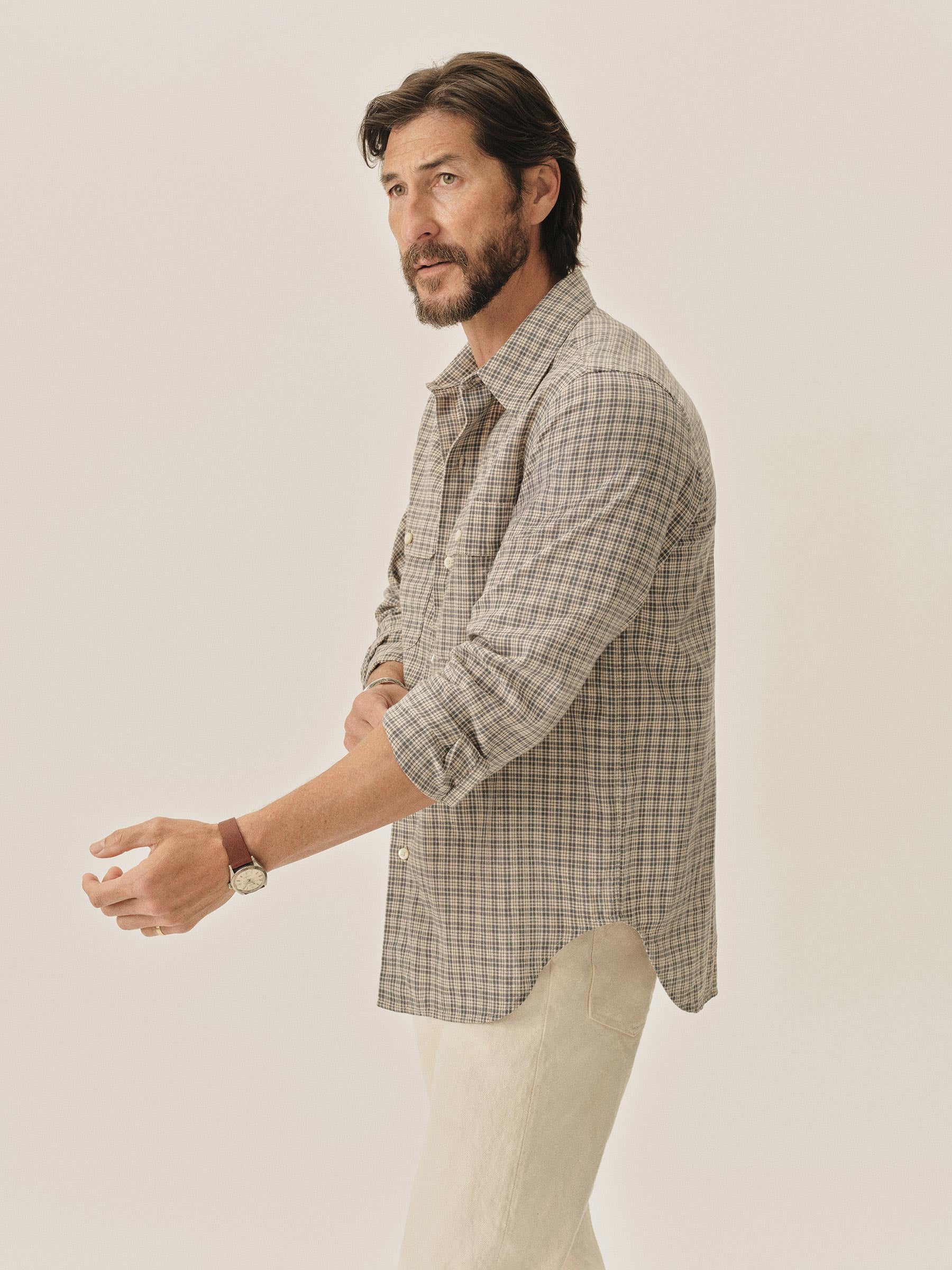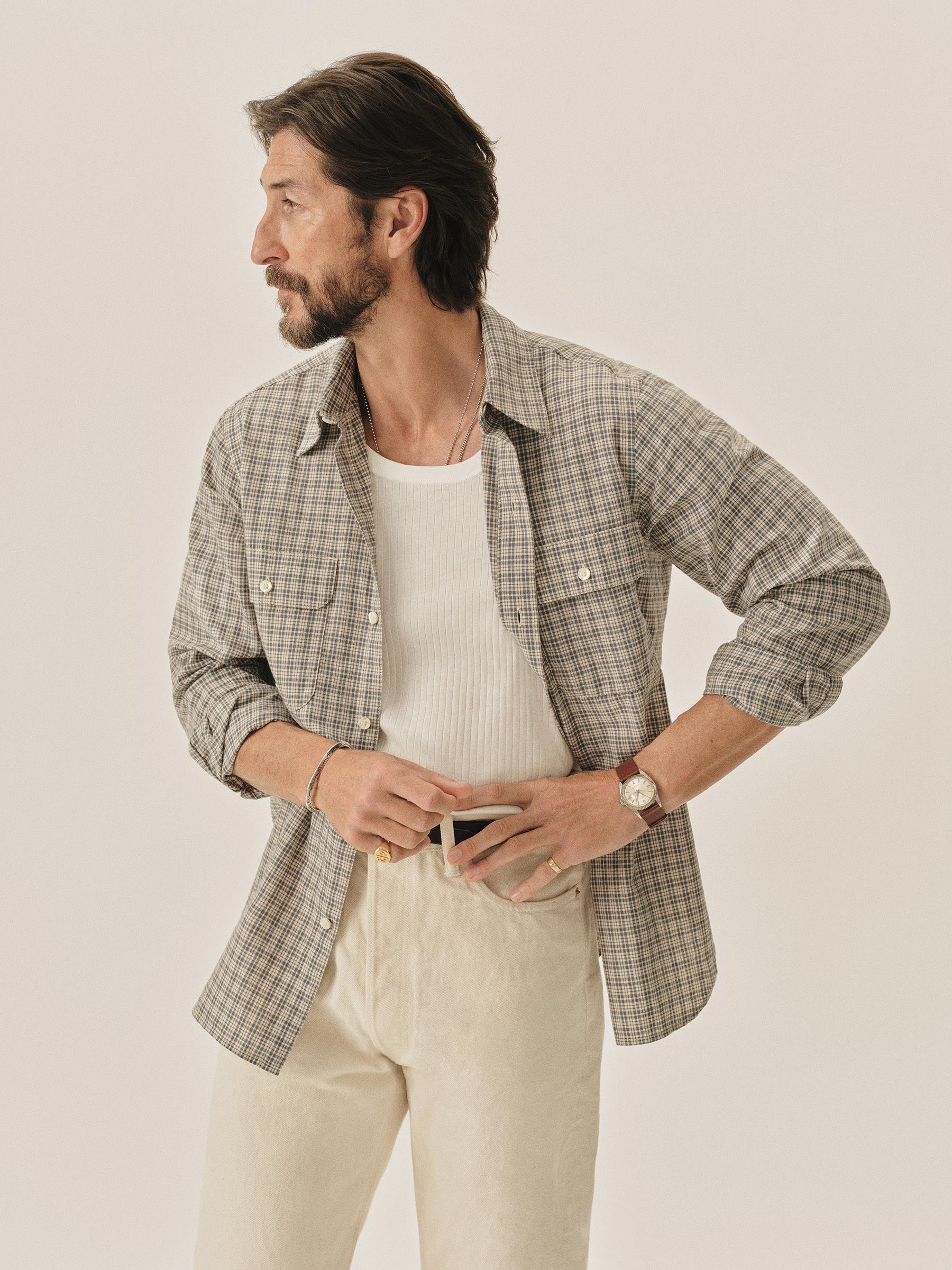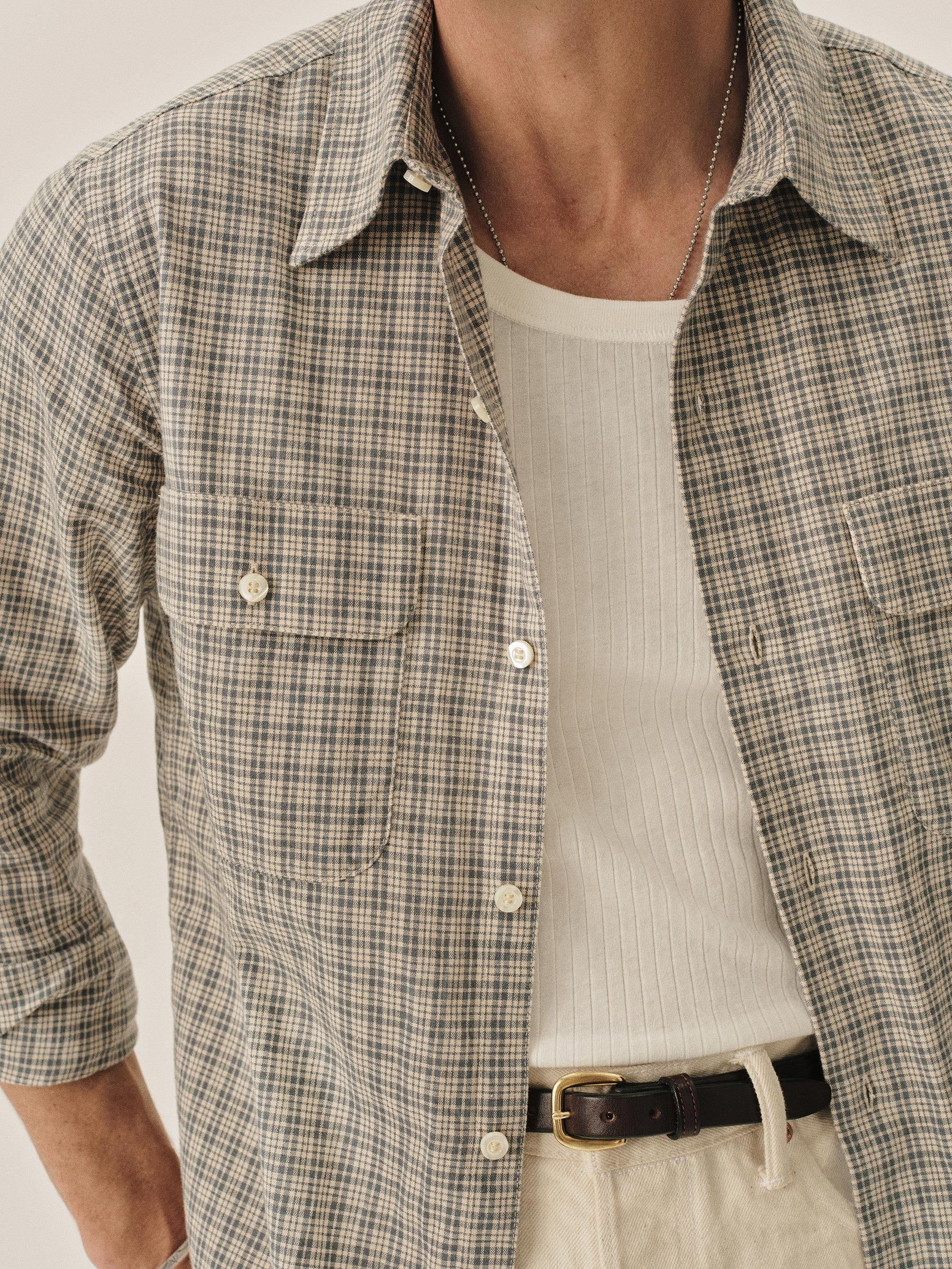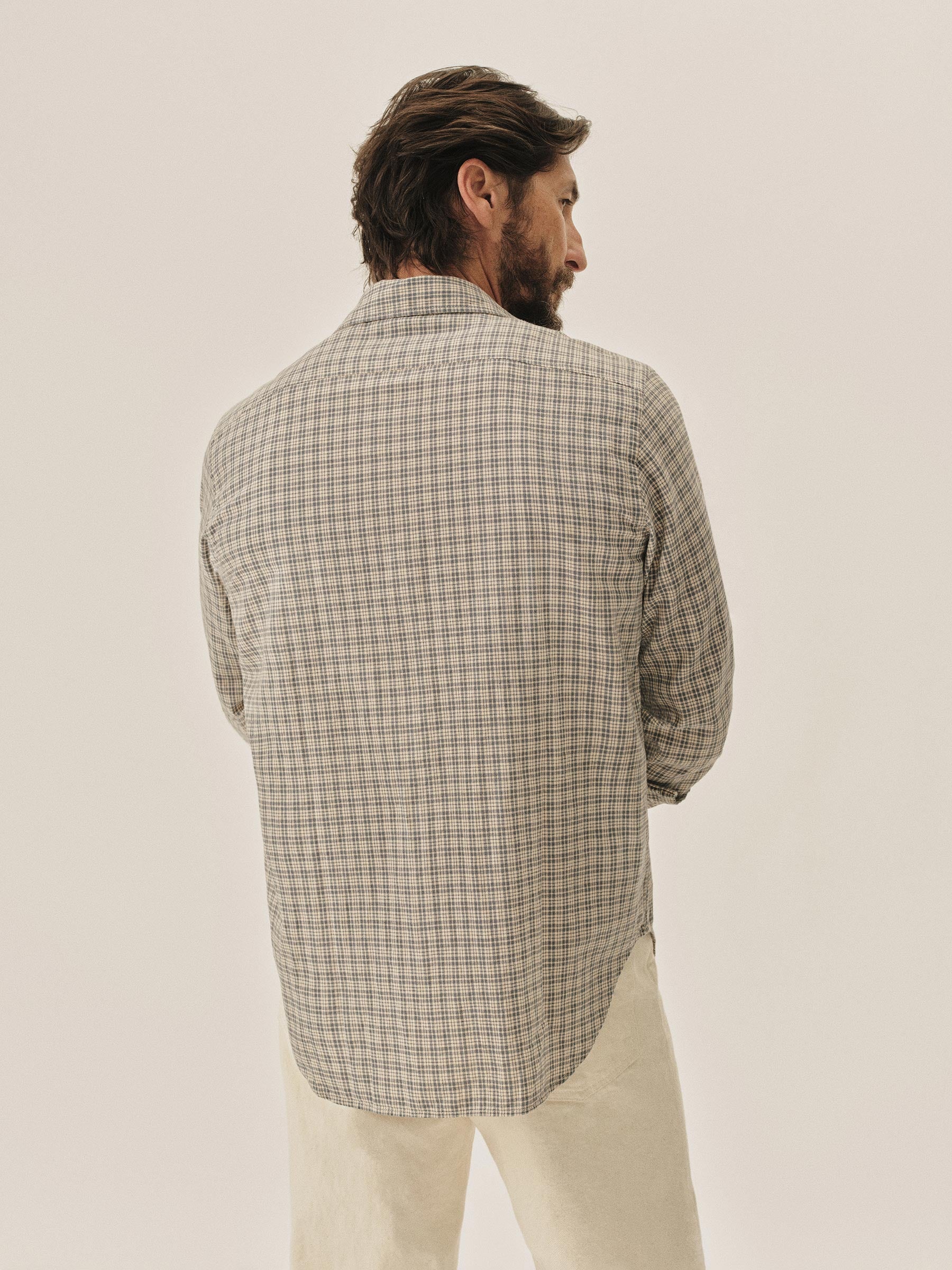 A midcentury-inspired button-up with a perfectly proportioned point collar, single chest pocket, and a curved hem.