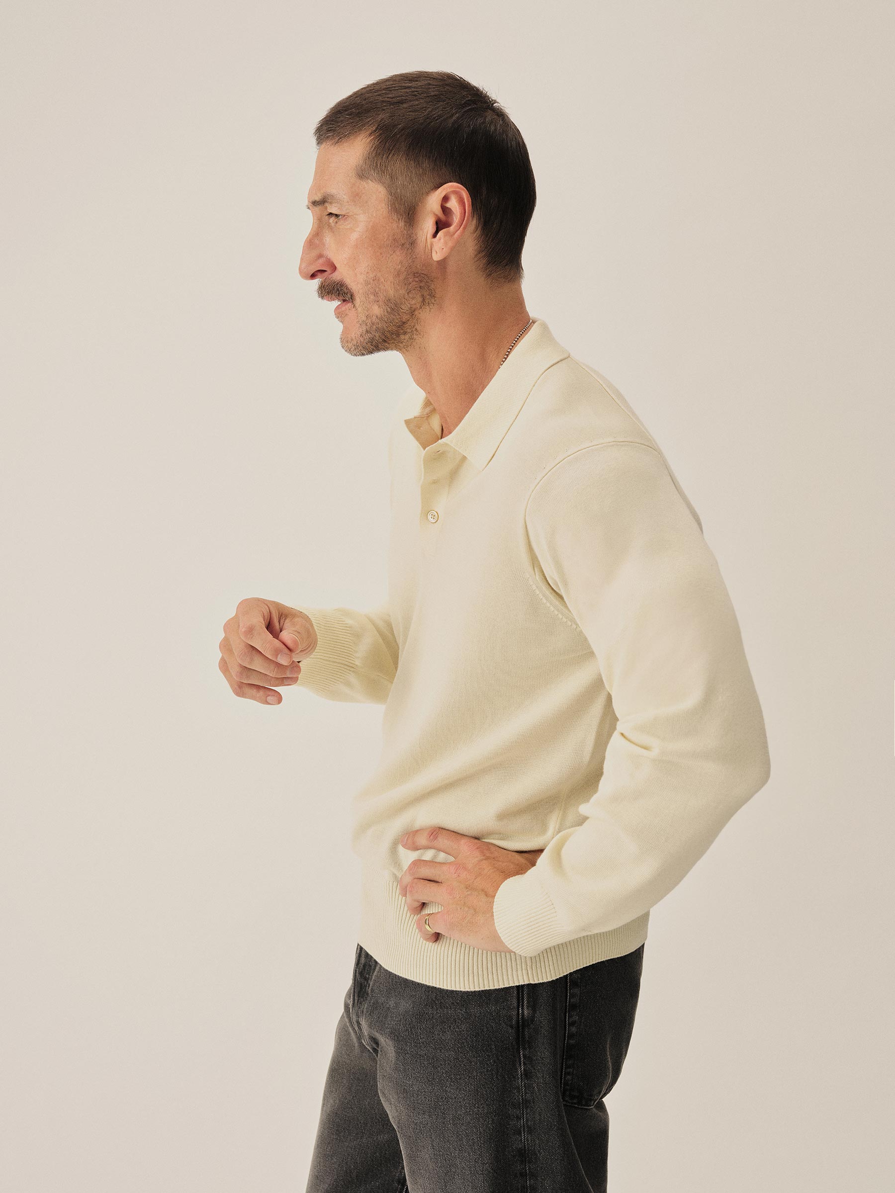 Classic fit, long sleeve polo, fully fashioned from an ultrafine blend of organic Egyptian cotton and cashmere, spun in Italy.