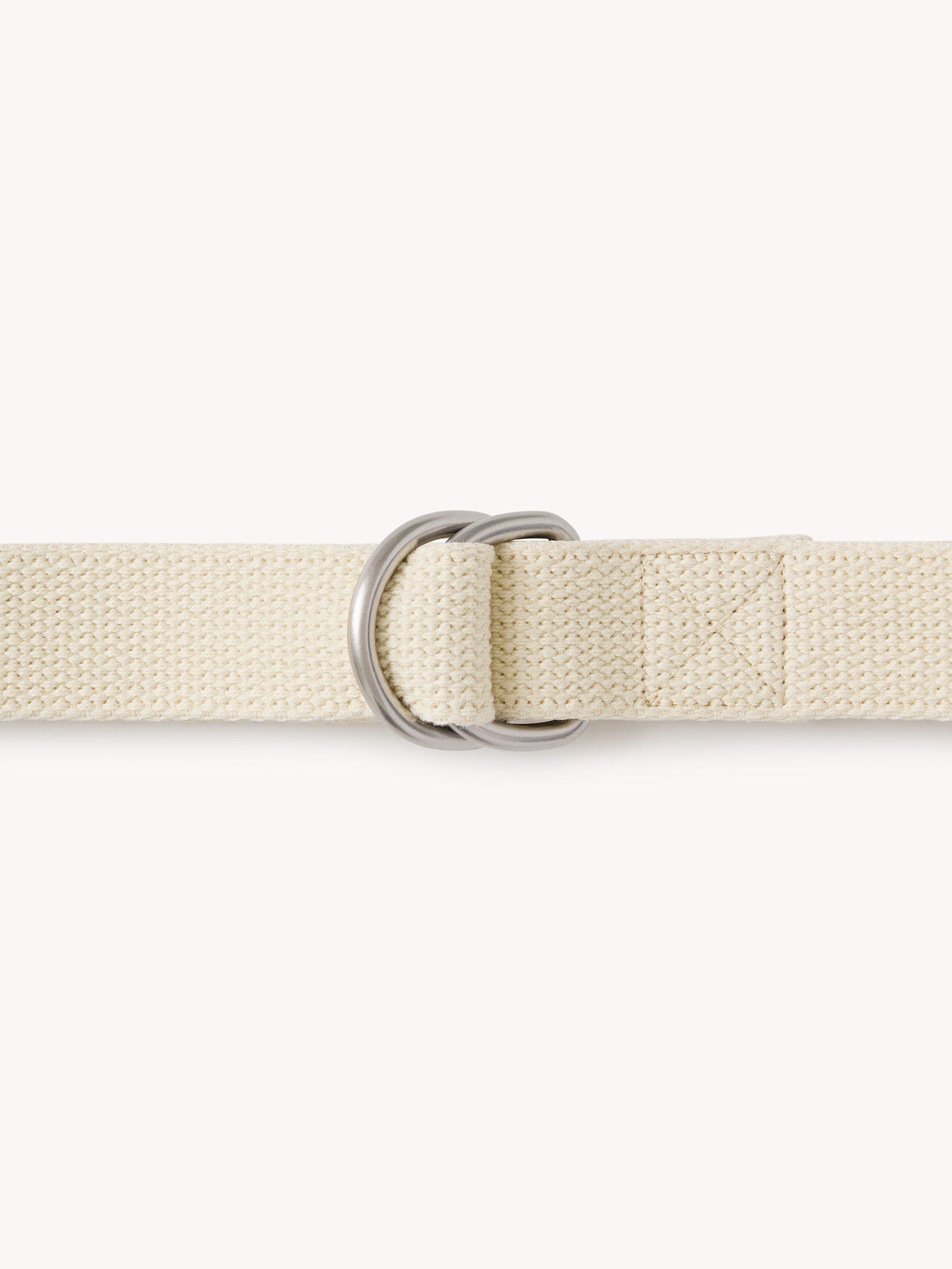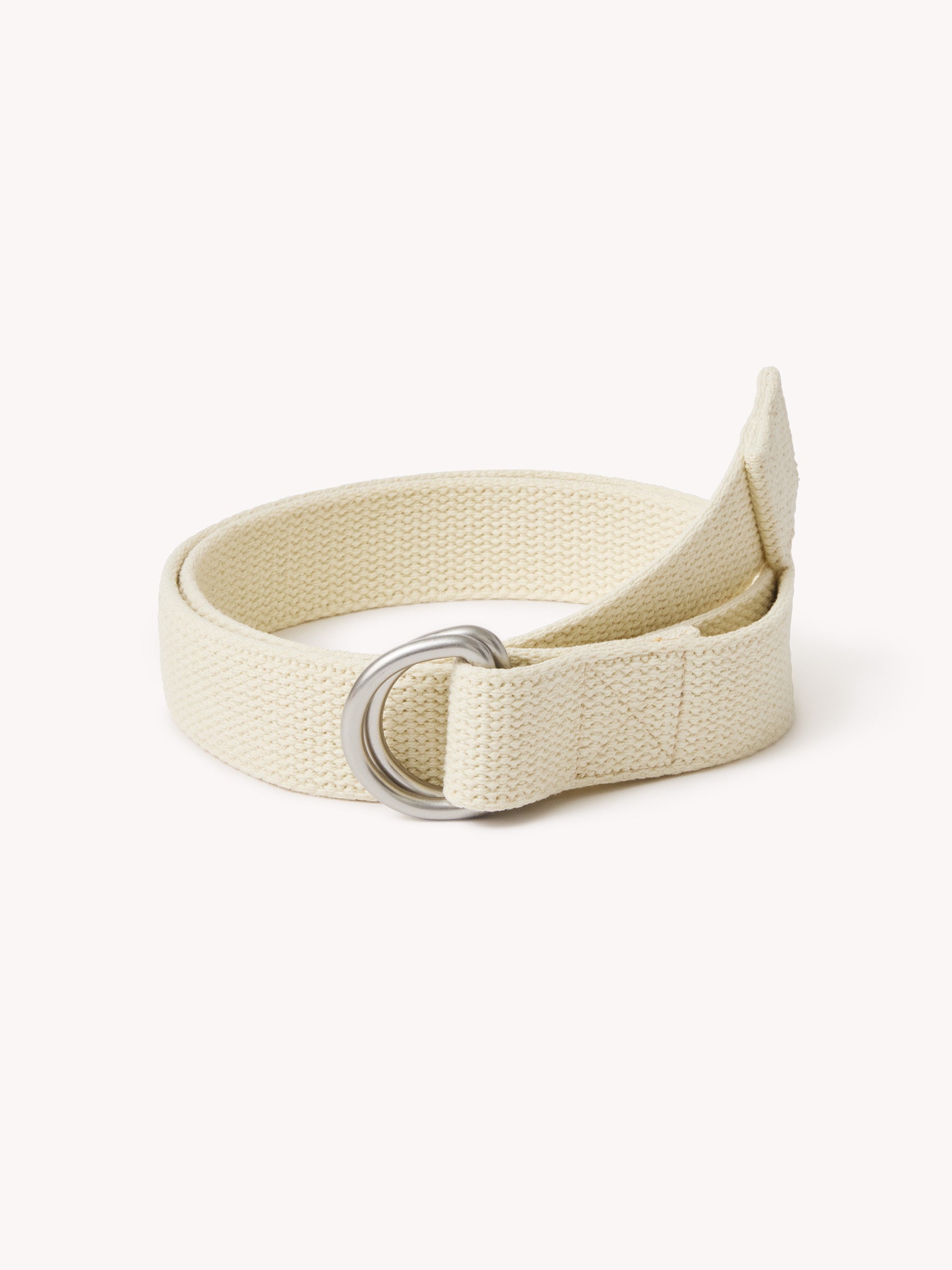 A utilitarian cotton web belt finished with a metal D-ring closure.