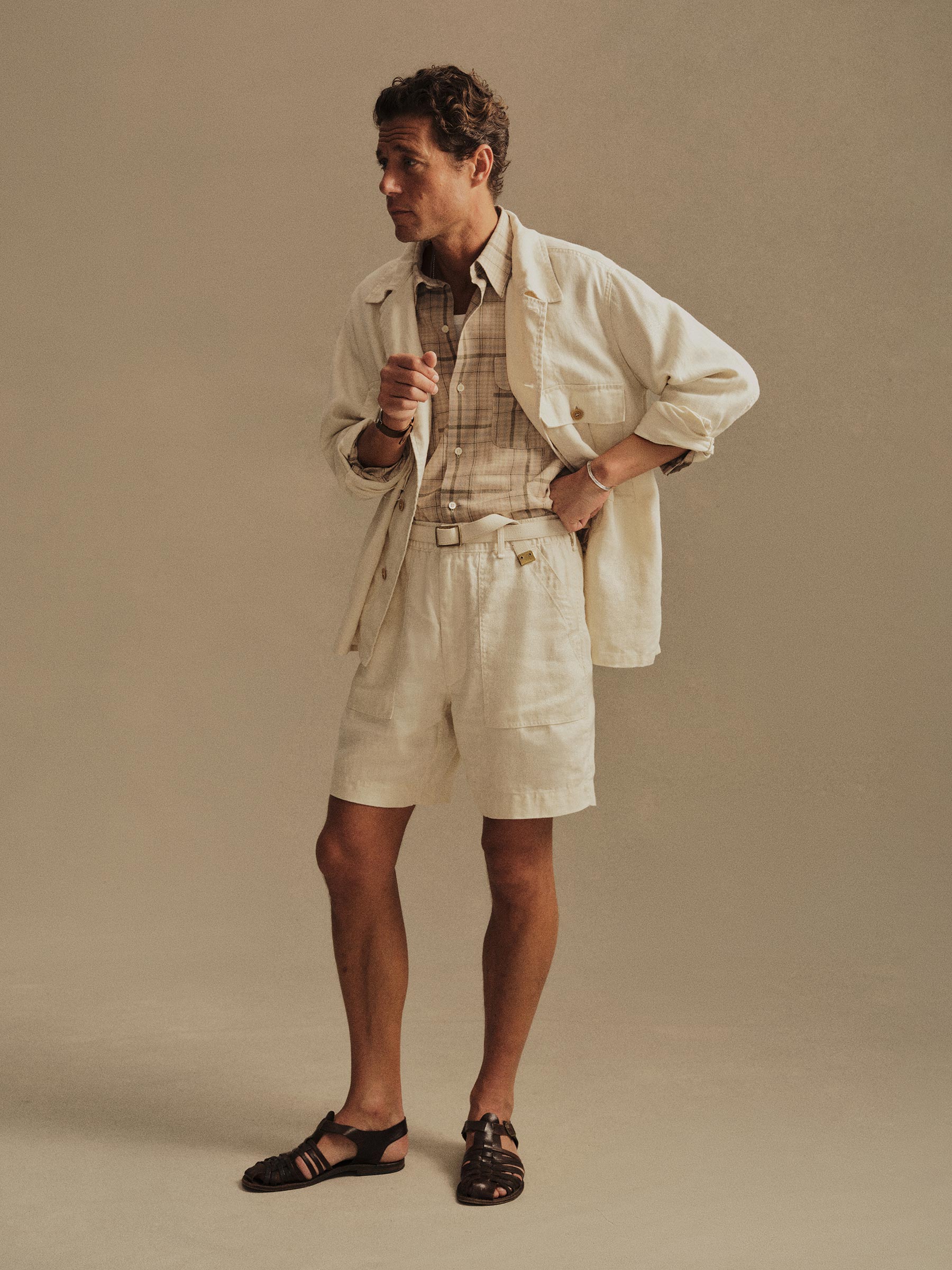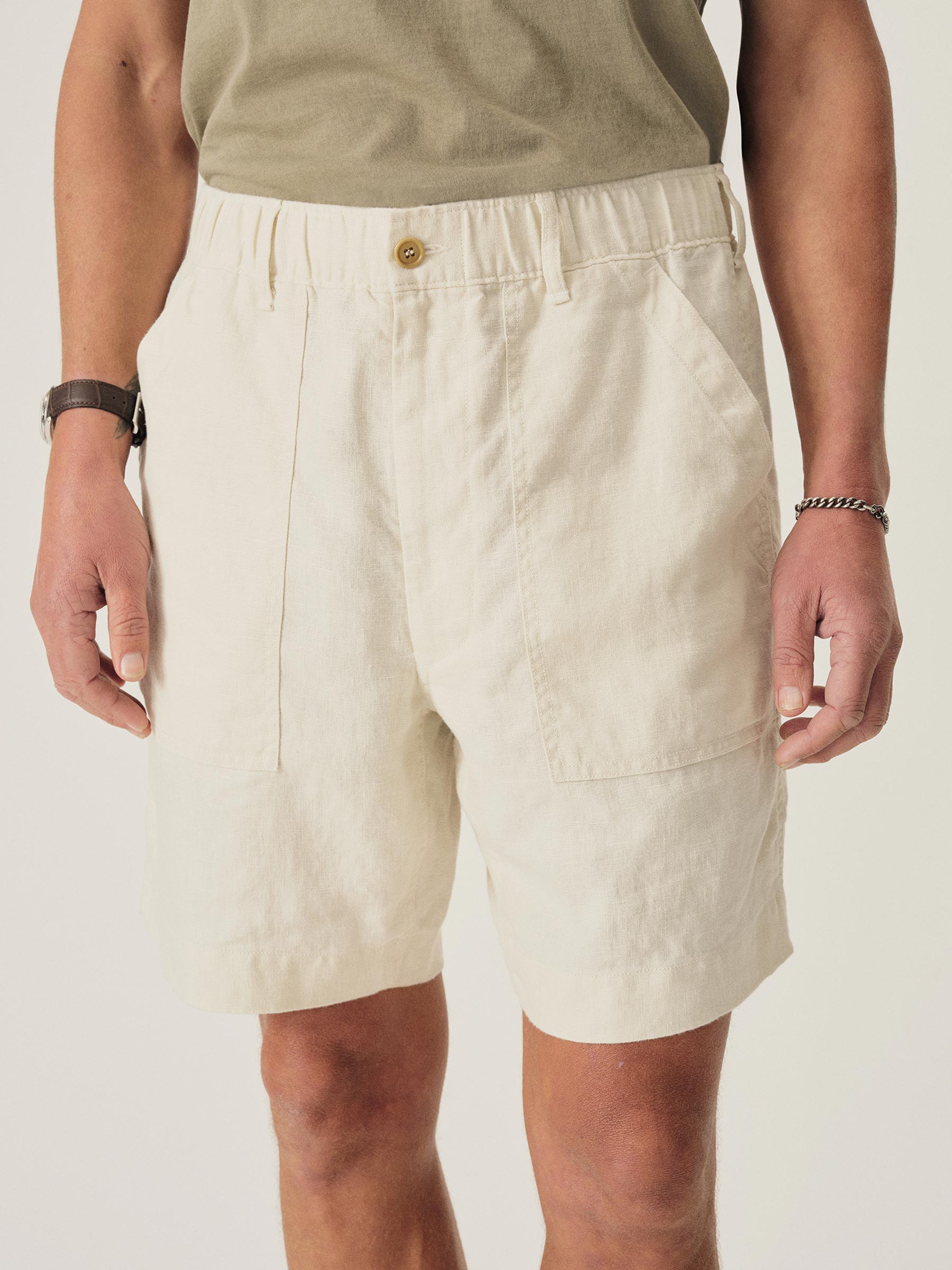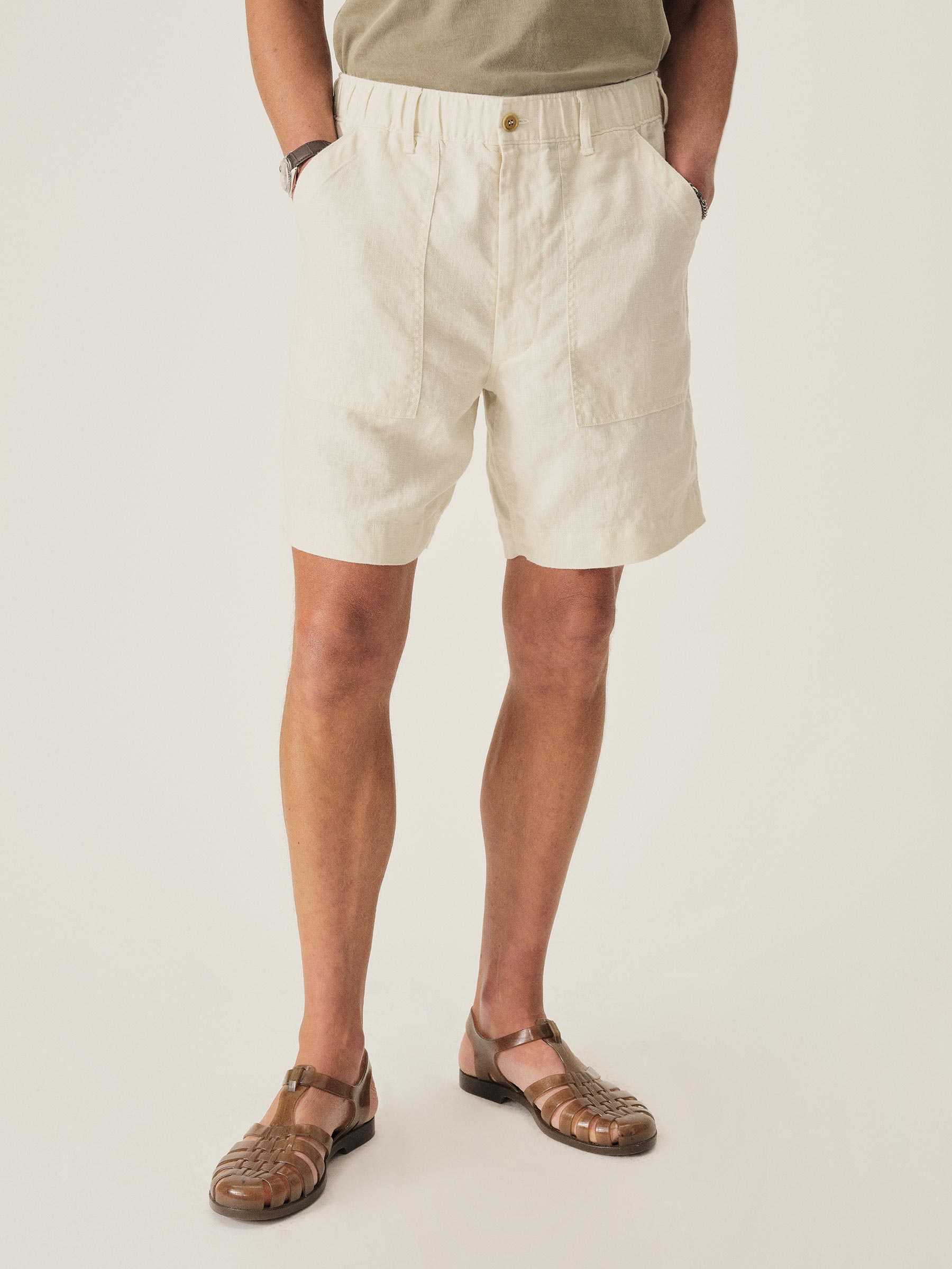 Army fatigue shorts upgraded in lightweight linen with an elasticated drawcord waistband.