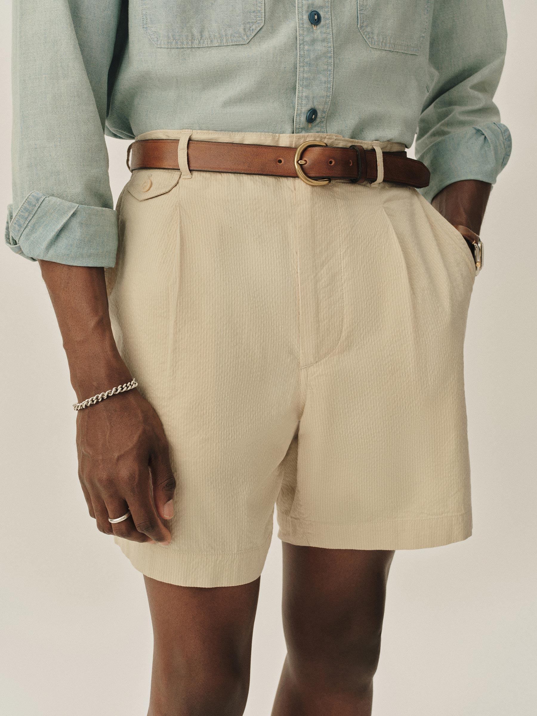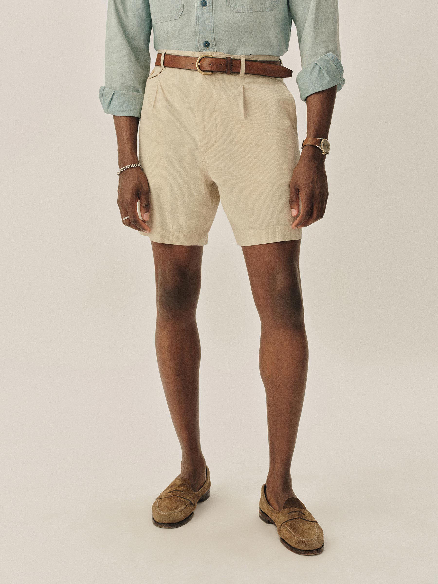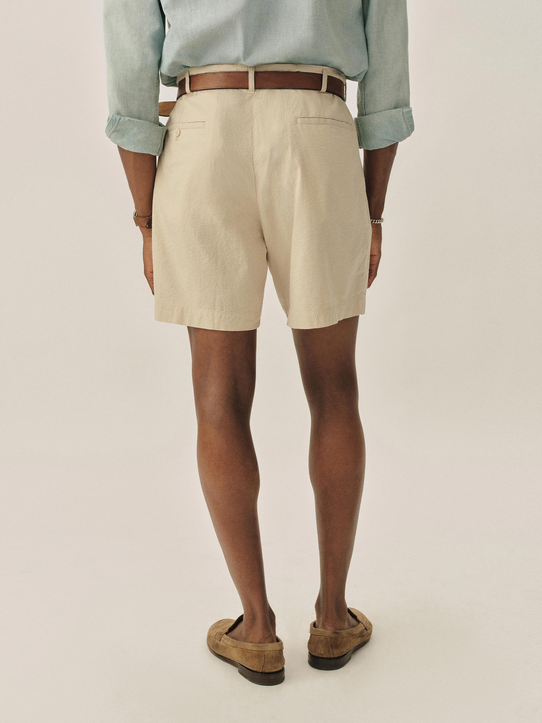 Classic fit, single-pleat shorts made from lightweight and breathable Japanese cotton seersucker.